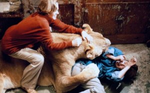FOR SUNDAY PULSE – FILM STILL CAPTION:ROAR_Kiss: Hank (Noel Marshall) receives a kiss from one of the lions in Drafthouse Films Roar. Courtesy of Drafthouse Films.