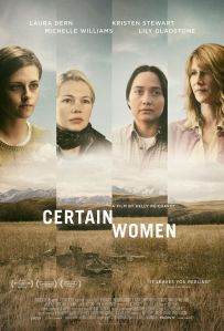 Acţiunea din CERTAIN WOMEN (premiul pentru cel mai bun film al Festivalului BFI din Londra), care are loc într-un orășel din Montana, se bucură de interpretări remarcabile a trei vedete care portretizează trei femei aflate în momente definitorii ale vieților lor. Laura Dern o joacă pe o avocată nemulțumită de viața ei personală și se confruntă cu o dilemă morală legată de unul dintre clienții săi. Michelle Williams, colaboratoarea frecventă al lui Reichardt (WENDY & LUCY, MEEK’S CUTOFF), o interpretează pe Gina, o soție și o mamă prinsă într-un moment dificil al căsniciei sale. Ultimul capitol al acestei pastorale americane îi este dedicat iubirii neîmpărtăşite dintre o fermieră anonimă și o profesoară de drept din oraș, jucată cu fragilitate de Kristen Stewart.