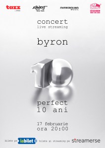 Miercuri, 17 februarie, începând cu ora 20.00, trupa byron va susține un concert în live streaming pe platforma streamerse.net. Evenimentul va marca aniversarea a 10 ani de la lansarea albumului Perfect și va fi transmis în direct de pe scena clubului Expirat din București.