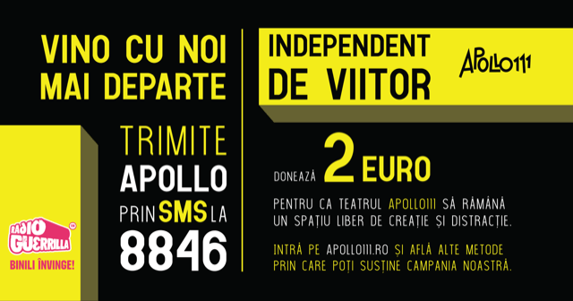 Teatrul independent Apollo111 lansează campania de donații „Independent de viitor”. După un an în care spațiile culturale pentru arte performative au fost mai mult închise din cauza pandemiei COVID-19, și fără un sprijin real venit din partea autorităților pentru sectorul cultural independent, Apollo111 face un apel la spectatori: pentru a reporni motoarele teatrului, aceștia pot dona 2 euro prin SMS la 8846, își pot redirecționa 3,5% din impozitul pe venit pentru cauză sau pot face donații direct. În centrul campaniei se află două scurtmetraje care spun povestea viitorului Apollo111, într-o lume în care restricțiile nu se ridică, iar artiștii sunt nevoiți să găsească soluții absurde pentru a continua să creeze. Pentru realizarea scurtmetrajelor, scenograful Marius Nițu a creat o impresionantă machetă arhitecturală a spațiului Apollo111, care a prins viață datorită unor păpuși de lemn animate. Vocile primului episod sunt asigurate de actorii Bogdan Dumitrache, István Téglás, Ioana Bugarin, Eduard Trifa și de Eugen Rădescu. Imaginea este semnată de Vlad Mihuțoiu. Filmul poate fi urmărit pe www.Apollo111.ro.