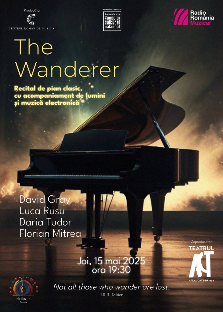 Evenimentul de deschidere va avea loc joi 15 mai, de la ora 19:30, la Teatrul ACT și poartă semnătura lui David Gray, pianist și designer de concept. The Wanderer este mai mult decât un concert de pian – este un concept inovator ce revoluționează experiența muzicii clasice. Prin asocierea cu un spectacol de lumini ce reflectă emoția transmisă de sunet și un soundscape de muzică electronică, The Wanderer aduce recitalul clasic de pian în plin mileniu III. Fiecare piesă muzicală este o etapă a unei călătorii inițiatice: de la rătăcirea în tumultul pasiunilor omenești, la confruntarea cu propria umbră și, în cele din urmă, la răscumpărare și mântuire. Biletele au fost puse deja în vânzare: https://bit.ly/HoinarWanderer