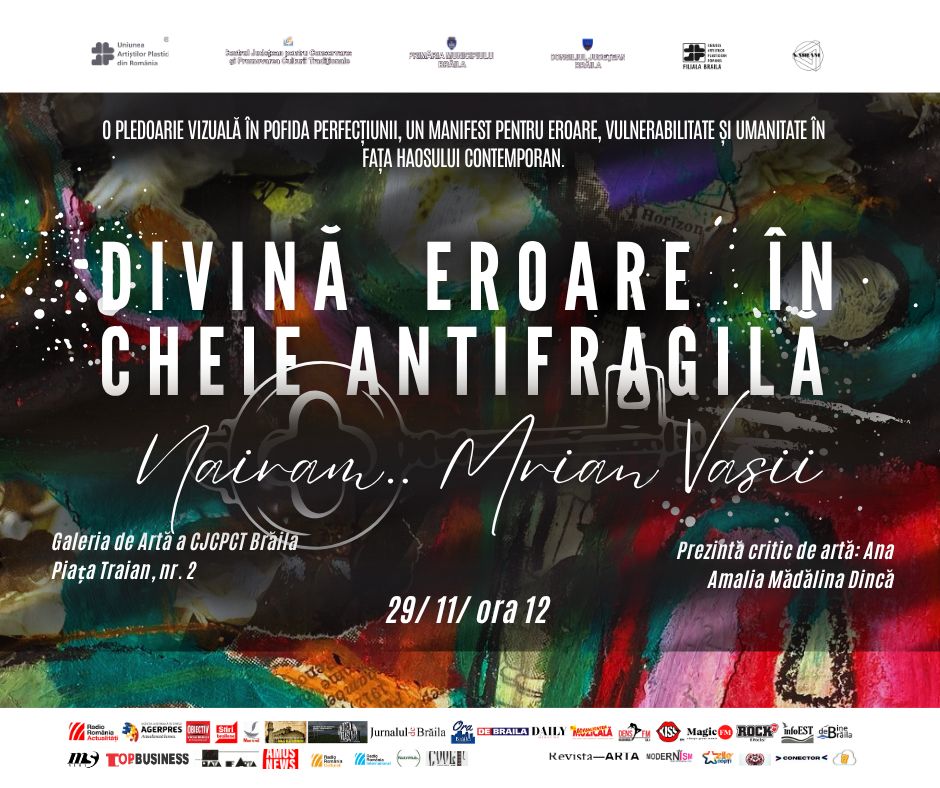 Sambata, 29 noiembrie, incepand cu ora 12:00 la Galeria de Arta a CJCPCT Braila (Piata Traian, nr. 2), publicul brailean este invitat la primul vernisaj personal ca membru stagiar al Uniunii Artistilor Plastici – filiala Brailaalscenografului si artistului vizual Nairam Marian Vasii, prezentat de criticul de arta Ana Amalia Madalina Dinca. Artistul aduce o colectie construita in trei ani, unde imperfectiunea si eroarea devin limbaj artistic, catharsis si forta regenerativa, iar evenimentul este cu vanzare, fiecare lucrare fiind insotita de certificat de autenticitate.
